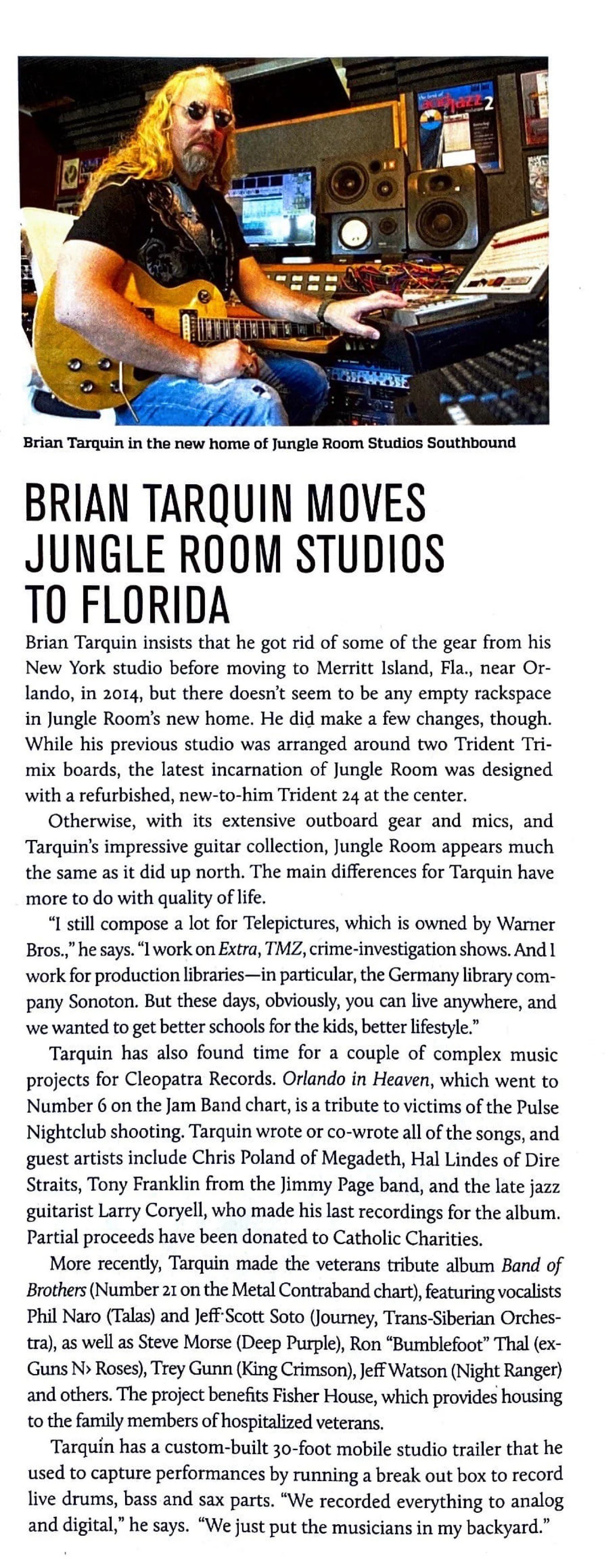 In 2006, Tarquin opened his own boutique record label called BHP MUSIC/GUITAR TRAX RECORDS, specializing in instrumental guitar music. The label releases the Guitar Master Series featuring legends: Jeff Beck, Jimmy Page, Larry Coryell, Joe Satriani, Steve Vai, Allan Holdsworth and Steve Morse. Simultaneously he built Jungle Room Studios where he records many of the releases for his record label. Jungle Room is an extensive mobile analog/digital recording studio located on the beautiful shores of Cape Canaveral, Florida featuring a classic 1980’s British Trident 24 recording console with analog tape machines as Otari MTR 90, an Ampex 440c and a plethora of delicious analog gear!